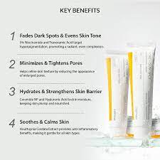 يتميز هذا الكريم بمكونات مُشرقة مثل حمض الترانيكساميك، والنياسيناميد، وميلازيرو V2، مما يُثبط إنتاج الميلانين لتقليل البقع الداكنة وتوحيد لون البشرة. كما يُوفر السيراميد NP وحمض الهيالورونيك المُحلل في هذا المزيج ترطيبًا عميقًا للبشرة.