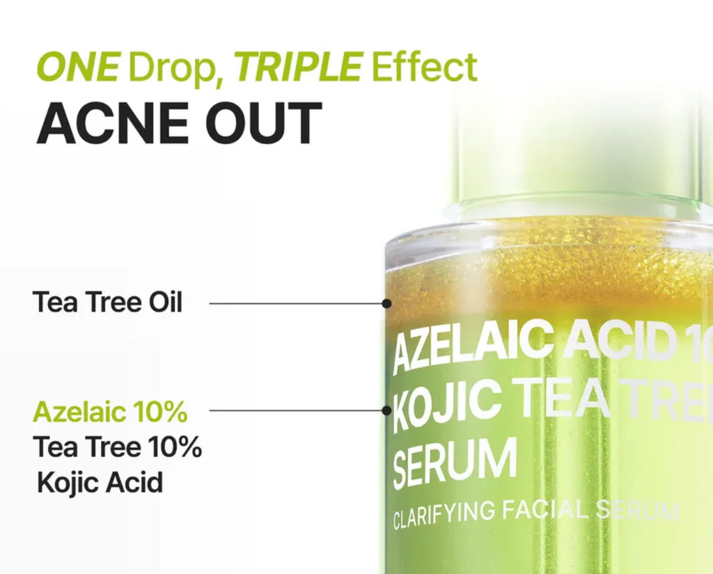 تصرفي بسرعة وحافظي على هدوئكِ في حالات حب الشباب الطارئة مع سيروم شجرة الشاي الكوجيك بحمض الأزيليك 10، الذي يمنحكِ تأثيرات مهدئة فورية! غني بزيت شجرة الشاي وحمض الأزيليك وحمض الكوجيك لتهدئة الاحمرار، والتحكم في إفراز الدهون الزائدة، وتفتيح البشرة. يعمل هذا السيروم بسرعة على تقليل ظهور البثور وإخفاء ندبات حب الشباب العنيدة.